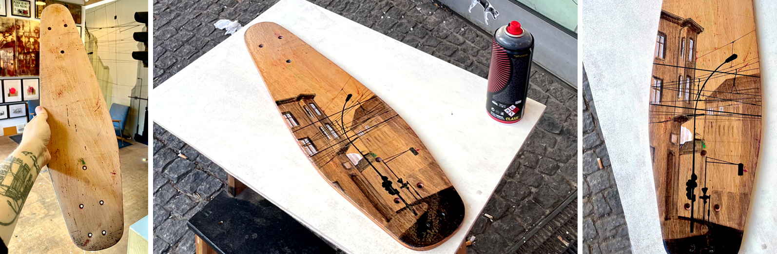 Various products, way more than shown here. Skateboards, Tees, Artprints… Custom made on